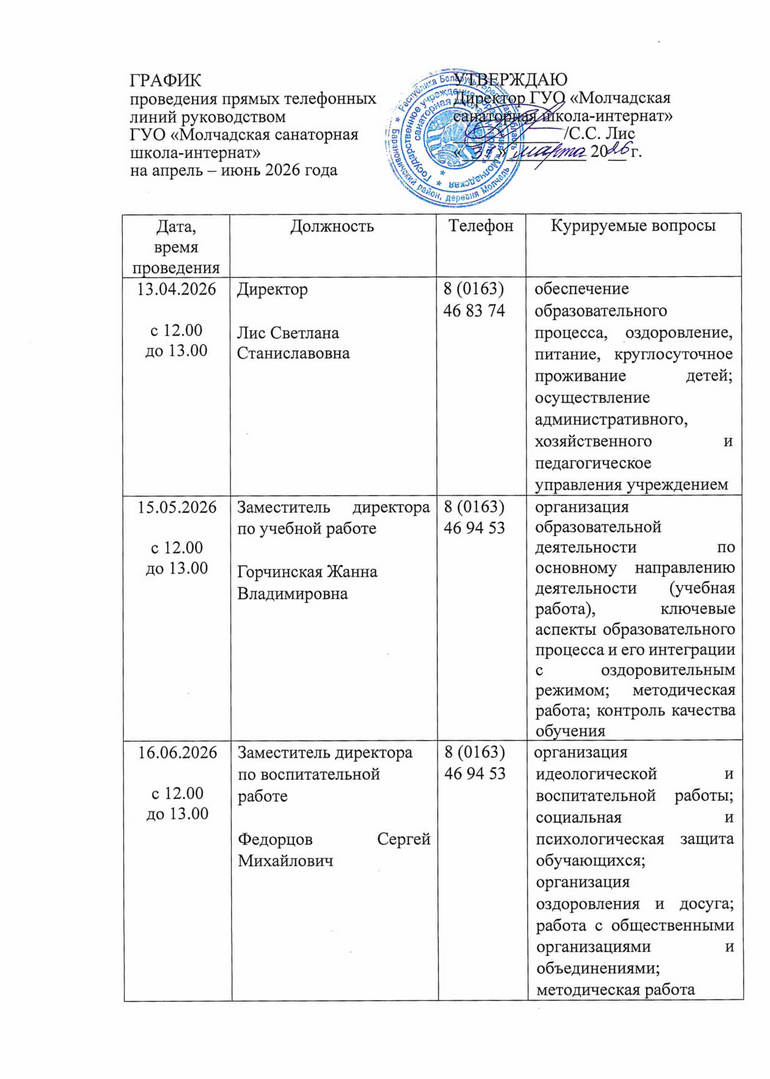 ГУО "МОЛЧАДСКАЯ САНАТОРНАЯ ШКОЛА-ИНТЕРНАТ" » График проведения прямых телефонных линий руководством